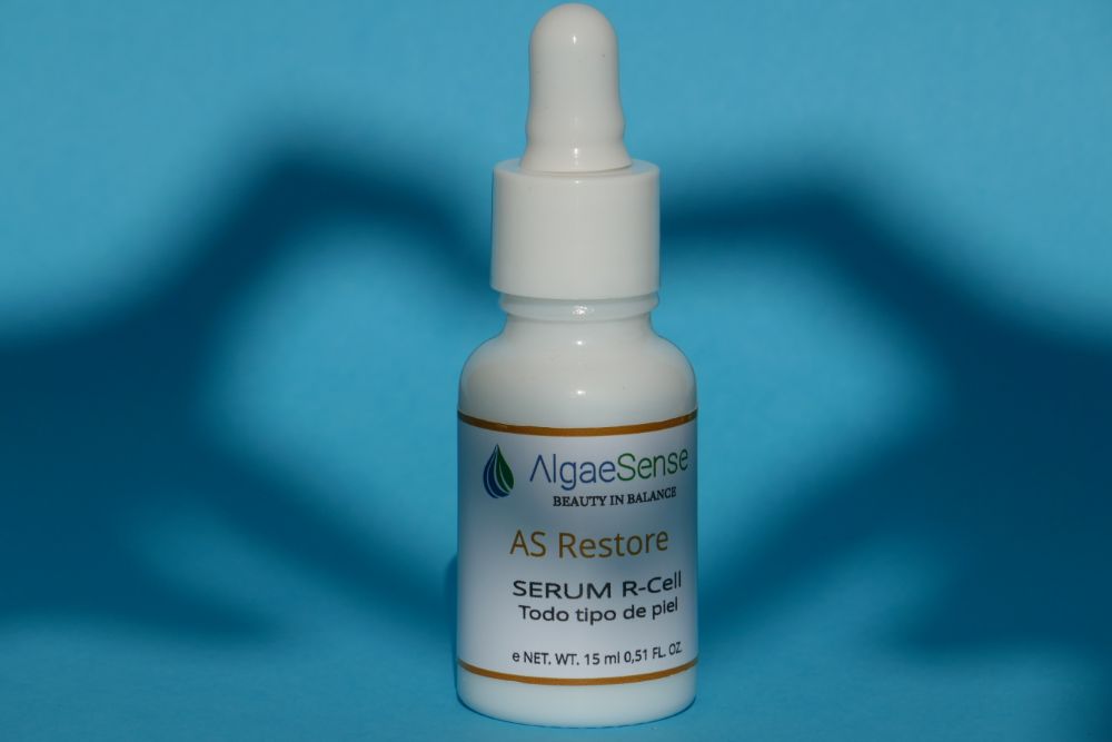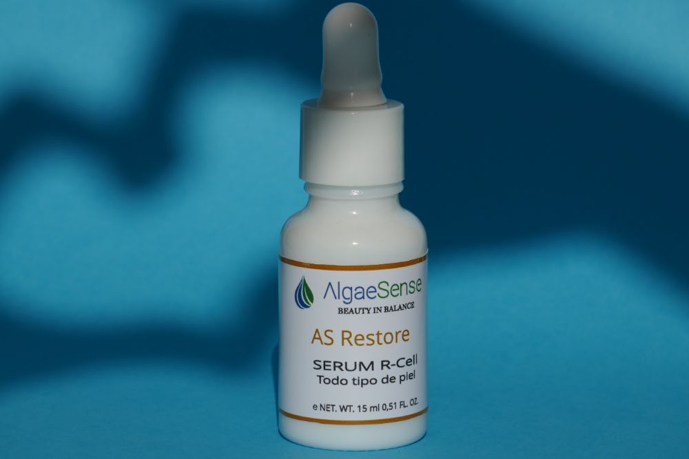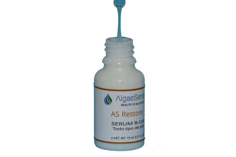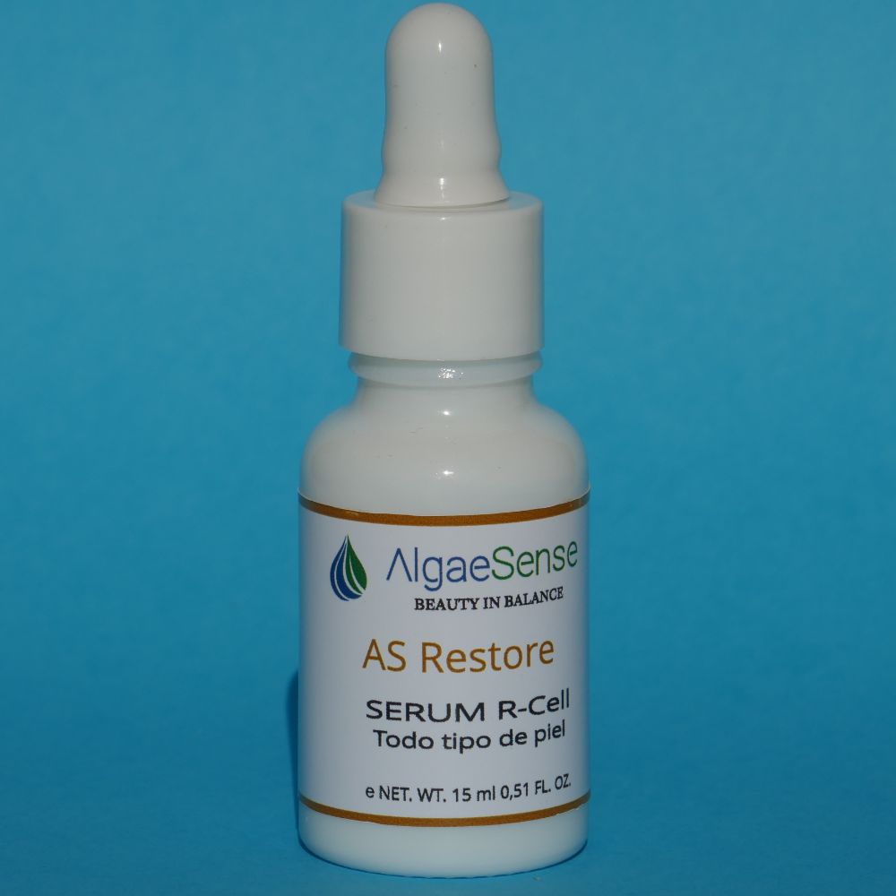 El serum R-Cell es un fluido denso de absorción lenta y profunda que discurre por tu rostro dispersando nutrientes y biomoléculas que proporcionan la esencia de los extractos marinos de AlgaeSense